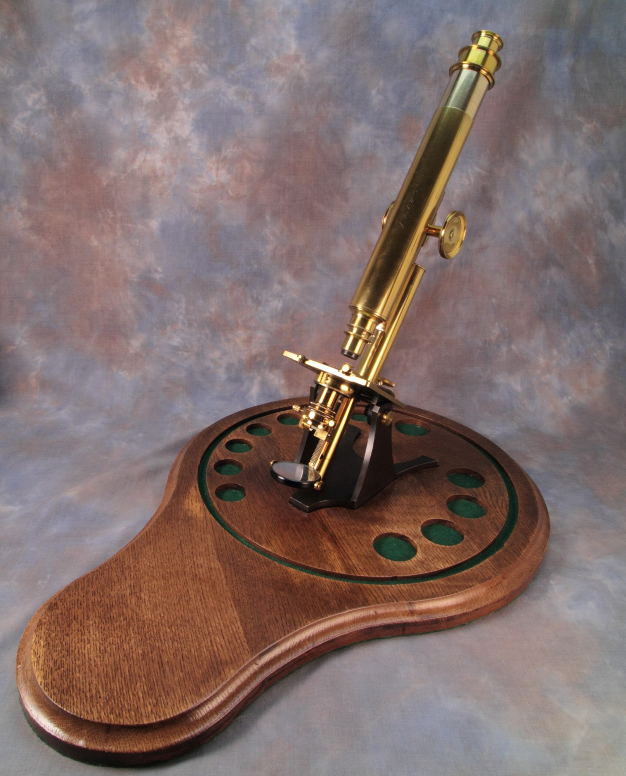 Board for displaying microscope under a bell jar made by a carpenter friend of mine.
